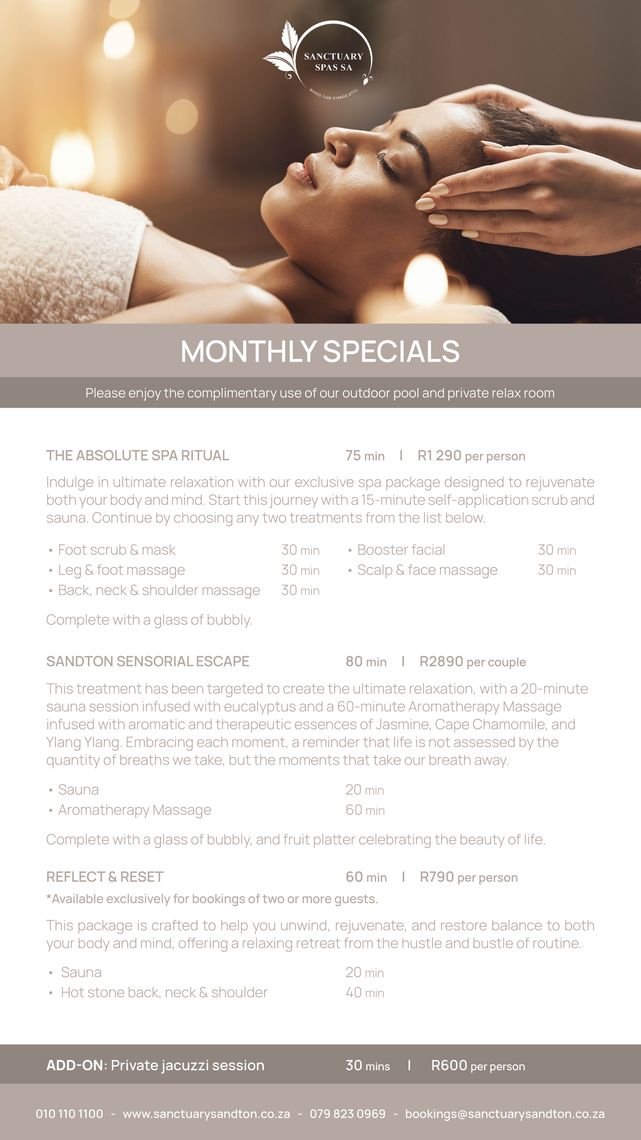 At our Sanctuary Spa in Sandton, located at The Catalyst Hotel, we offer a number of treatment rooms as well as a sauna and jacuzzi for additional relaxation.